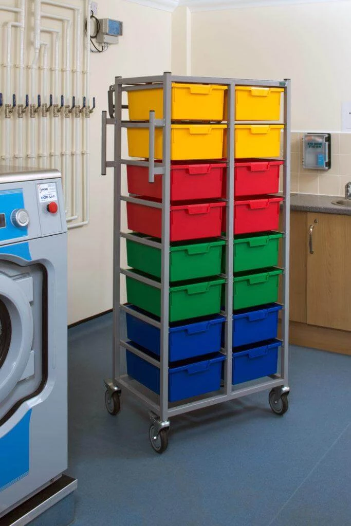 These Karri-Carts are designed as sturdy stacking units for the distribution of clean personal clothing. The Karri-Carts are made from a high quality MRSA resistant powder coated steel. They are lightweight and come complete with a selection of coloured trays for ease of sorting as well as a robust hanging rail to transport products on hangers. Twin – 16 trays with garment rail 166 x 71 x 54 cm